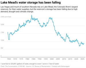 To ensure that water is shared across boundaries, the seven states within the basin agreed to the Colorado River Compact in 1922, setting limits on water withdrawals from the river. Since then, the region has adopted additional rules, agreements and policies, collectively termed the “Law of the River.” But despite this compact, which the states are renegotiating in 2026, the basin’s water supply is shrinking.